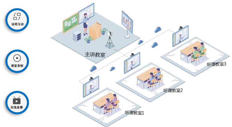 各課室建設(shè)錄播主機(jī),實(shí)現(xiàn)課堂師生畫面跟蹤,音視頻錄制、在線直播、點(diǎn)播。系統(tǒng)實(shí)現(xiàn)在授課過(guò)程中,本地教室與遠(yuǎn)程聽課教室之間的同步授課,以及實(shí)時(shí)音視頻互動(dòng)交流;(dòng)課程能夠同步錄制,真實(shí)展現(xiàn)互動(dòng)教學(xué)場(chǎng)景。積極推動(dòng)“一校帶多點(diǎn)”、“一校帶多!钡慕虒W(xué)和教研組織模式,逐步使依托信息技術(shù)的“優(yōu)質(zhì)學(xué)校帶薄弱學(xué)校、優(yōu)秀教師帶普通教室”模式制度化。