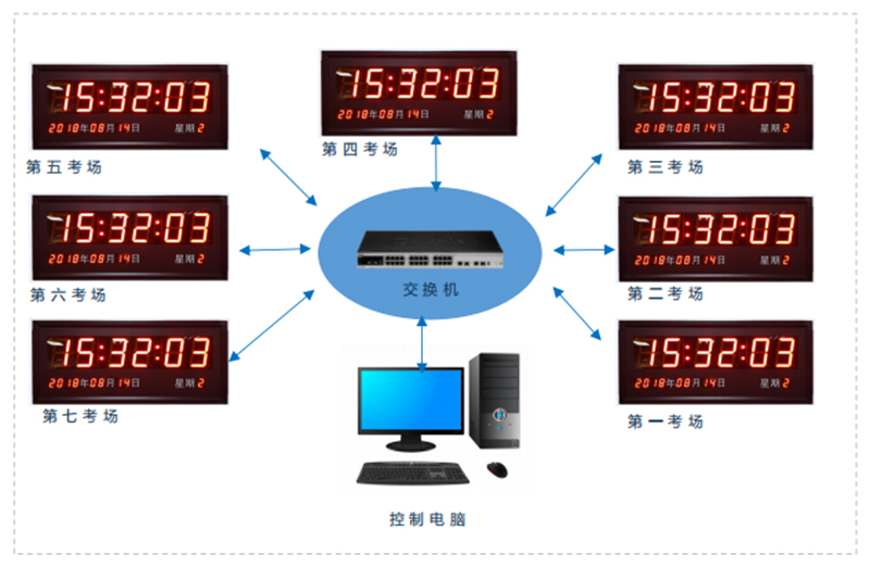 在學(xué)?紙(chǎng)設(shè)計(jì)LED電子鐘,讓考生能時(shí)刻了解考試時(shí)間的進(jìn)度,把握好自己答題的節(jié)奏,考出自己應(yīng)有的水平,同時(shí)學(xué)?紙(chǎng)電子鐘能通過(guò)軟件統(tǒng)一對(duì)所有考場(chǎng)的電子鐘校時(shí),保證所有考生都在同一時(shí)間開始和結(jié)束考試,體現(xiàn)學(xué)校教學(xué)的嚴(yán)謹(jǐn)和保證考試的公平公正。